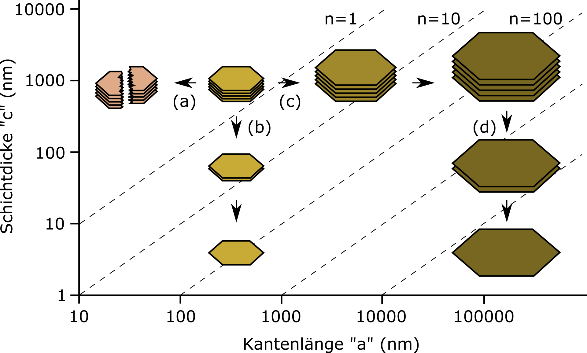 Abbildung 1: Schematische Darstellung des Zusammenhangs zwischen Kantenlänge "a" und Schichtdicke "c" von Tonmineralplättchen. In der Tonmineralsynthese und bei der Aufbereitung von Tonrohstoffen gibt es mehrere Prozesse, die das Aspektverhältnis maßgeblich beeinflussen. (a) Verringerung des Aspektverhältnisses durch mechanische Zerstörung, z. B. Mahlprozesse, (b) Erhöhung des Aspektverhältnisses durch Verringerung der Schichtdicke durch Exfoliation/Delamination, (c) Erhöhung des Aspektverhältnisses durch spezifisches Wachstum während der Synthese und (d) weitere Erhöhung des Aspektverhältnisses durch Exfoliation/Delamination, was zu sehr hohen Aspektverhältnissen führt.