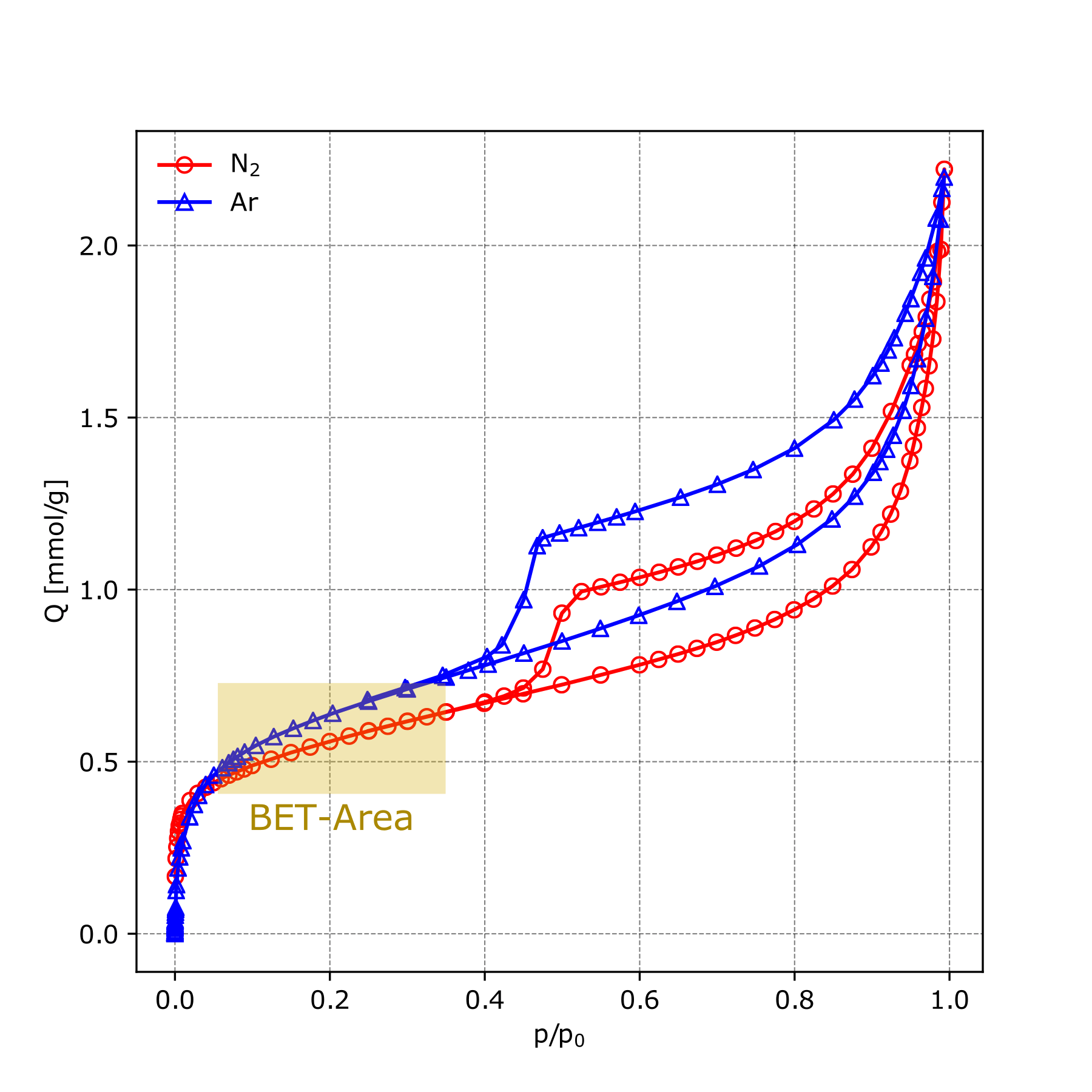 Physisorption analysis is an important method for determining the pore size distribution and characterising pore network structures of microporous samples. The analysis is based on the sorption of gases, which fill pores of different diameters at distinct partial pressures. From a complete adsorption and desorption isotherm, a complete pore size distribution in the micro, meso and macro pore range can be determined. In addition, statements can also be made about the pore network of a sample. Our laboratory has a range of different gases (N2, Ar, Kr and CO2) which can be used for physisorption measurements depending on the general application.