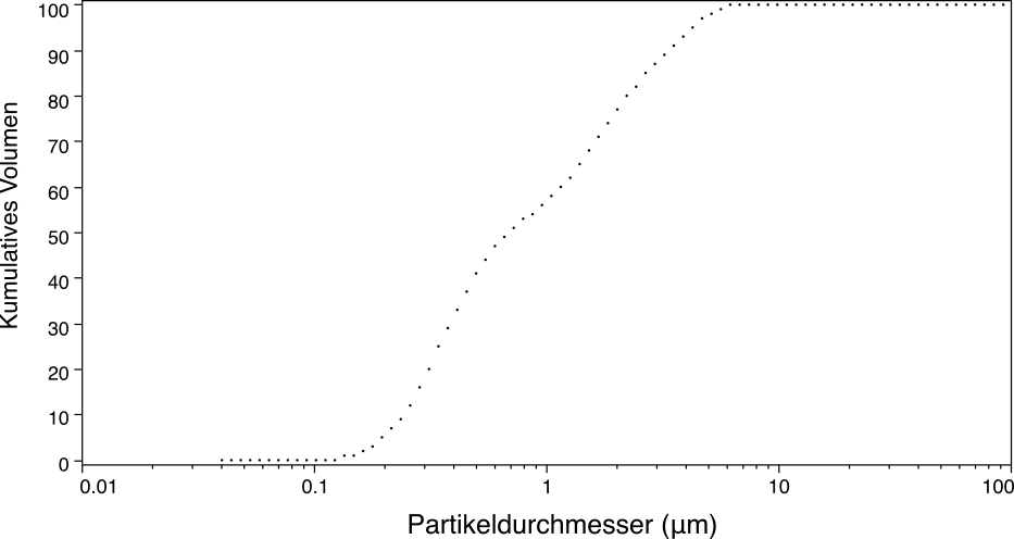 Abbildung 1: Diese Grafik zeigt die Partikelgrößenverteilung der Tonfraktion einer Sedimentprobe veranschaulicht mit Partikelgrößen zwischen 0.1 und 5 µm. Aufgetragen ist das kumulative Volumen in Vol.% der analysierten Probe als Funktion der durch akustische Spektroskopie ermittelten Partikeldurchmesser in µm. Die Kurve spiegelt eine bimodale Partikelgrößenverteilung wider.